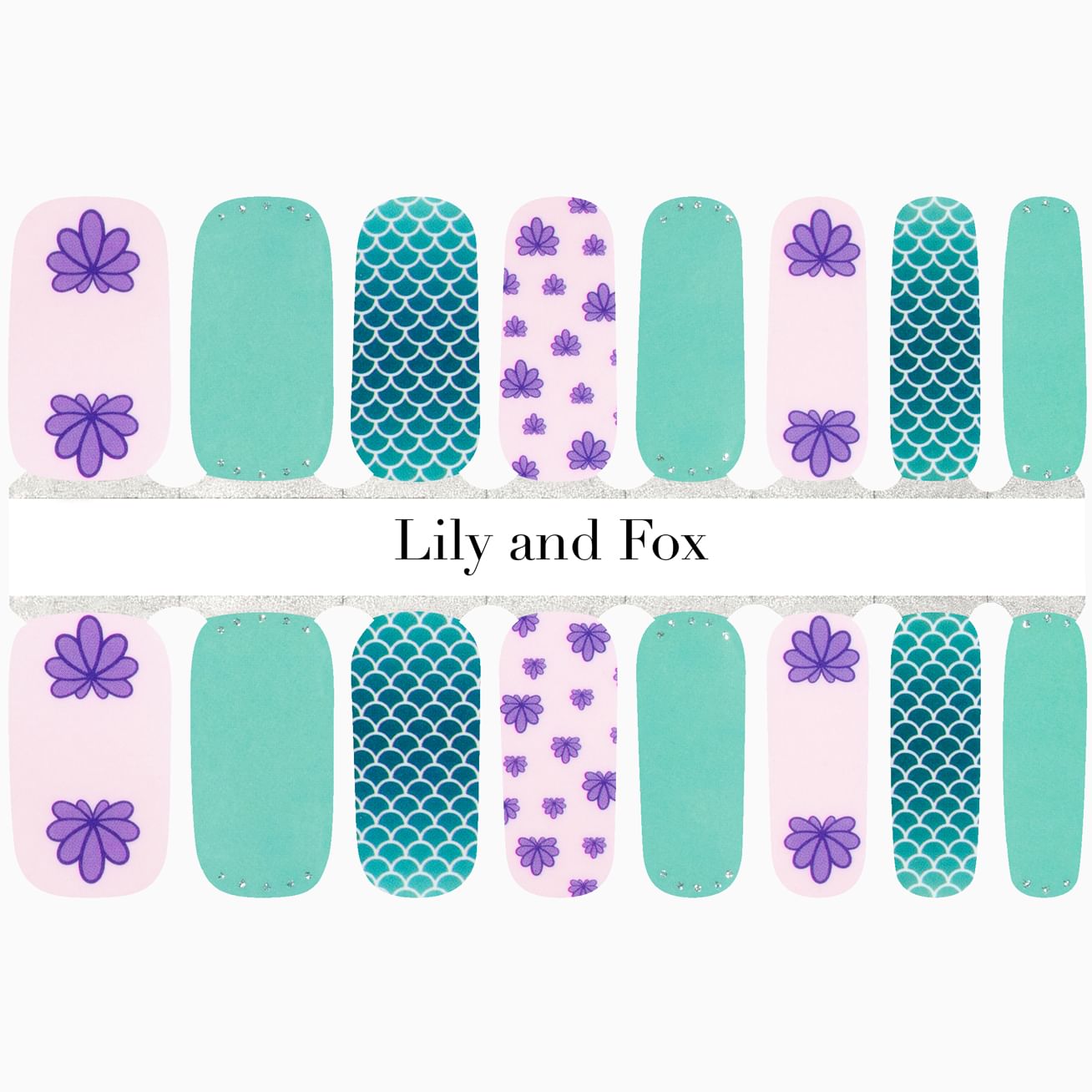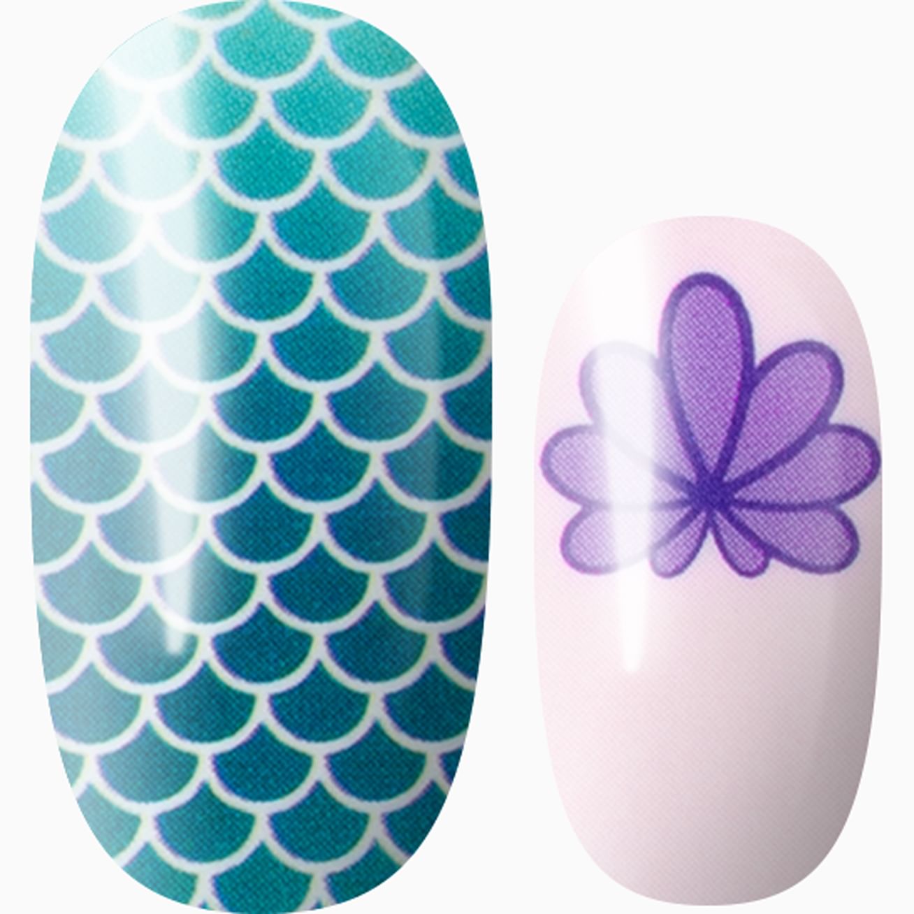 One of our most popular sets, Sea Fairy features pink and blue iridescent glitter against a glossy light blue background. A friendly reminder to all the water-loving mermaids: add a layer of top coat to protect this fantasy mani.