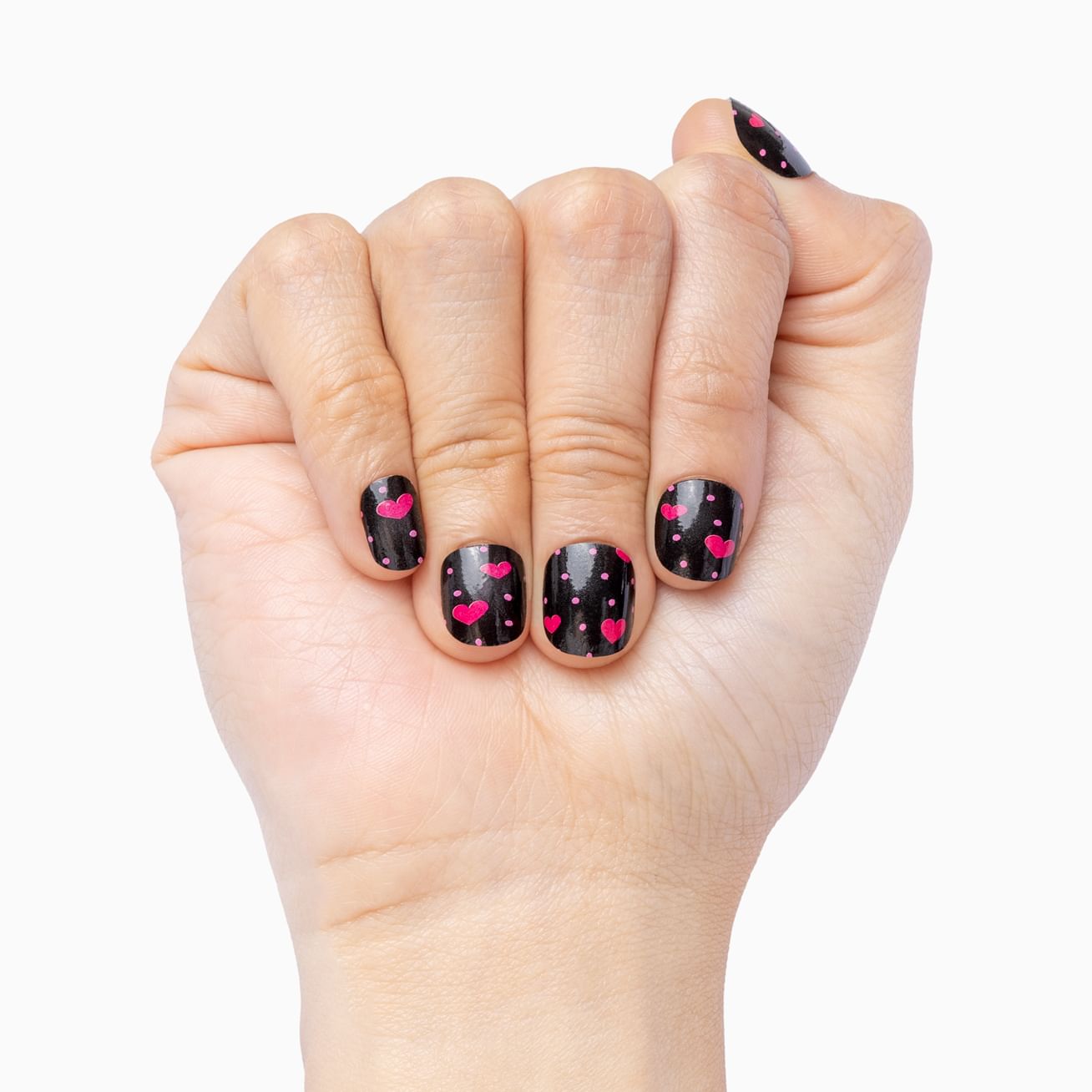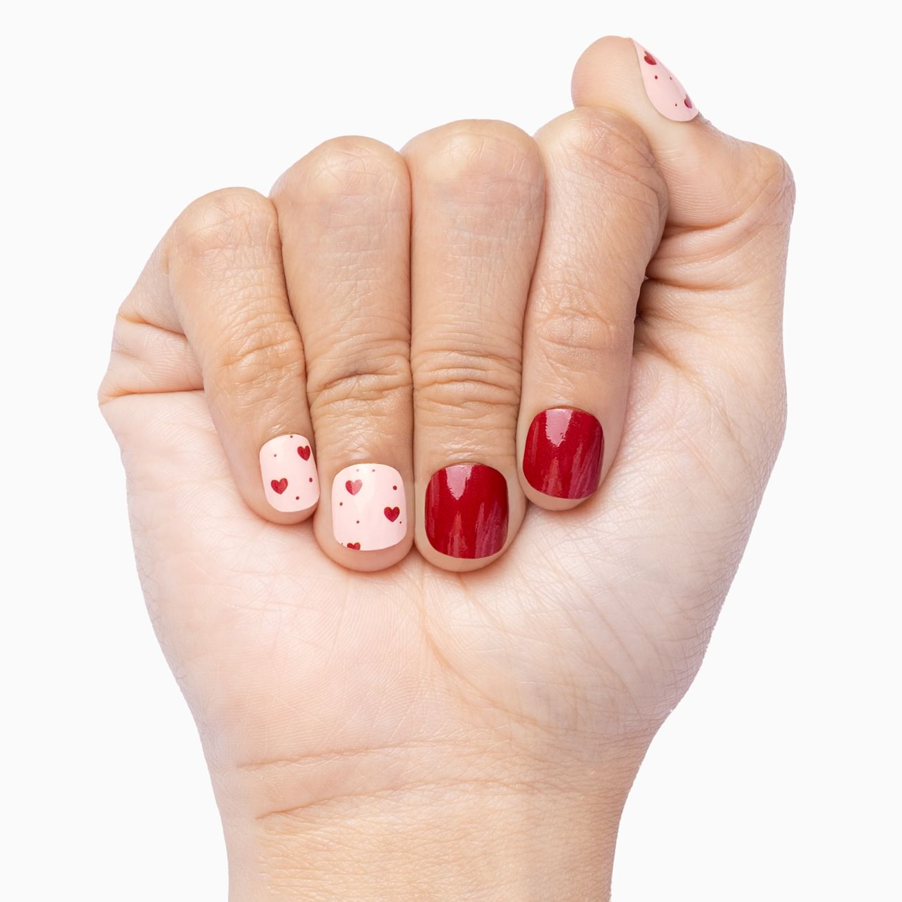 Wrap up your nails in cozy Christmas Pajamas, featuring a glossy red and black buffalo plaid background with snowflakes and playful transparent stripes to give a peek at your natural nails. Apply in minutes for a mani that gives Christmas morning vibes for weeks.