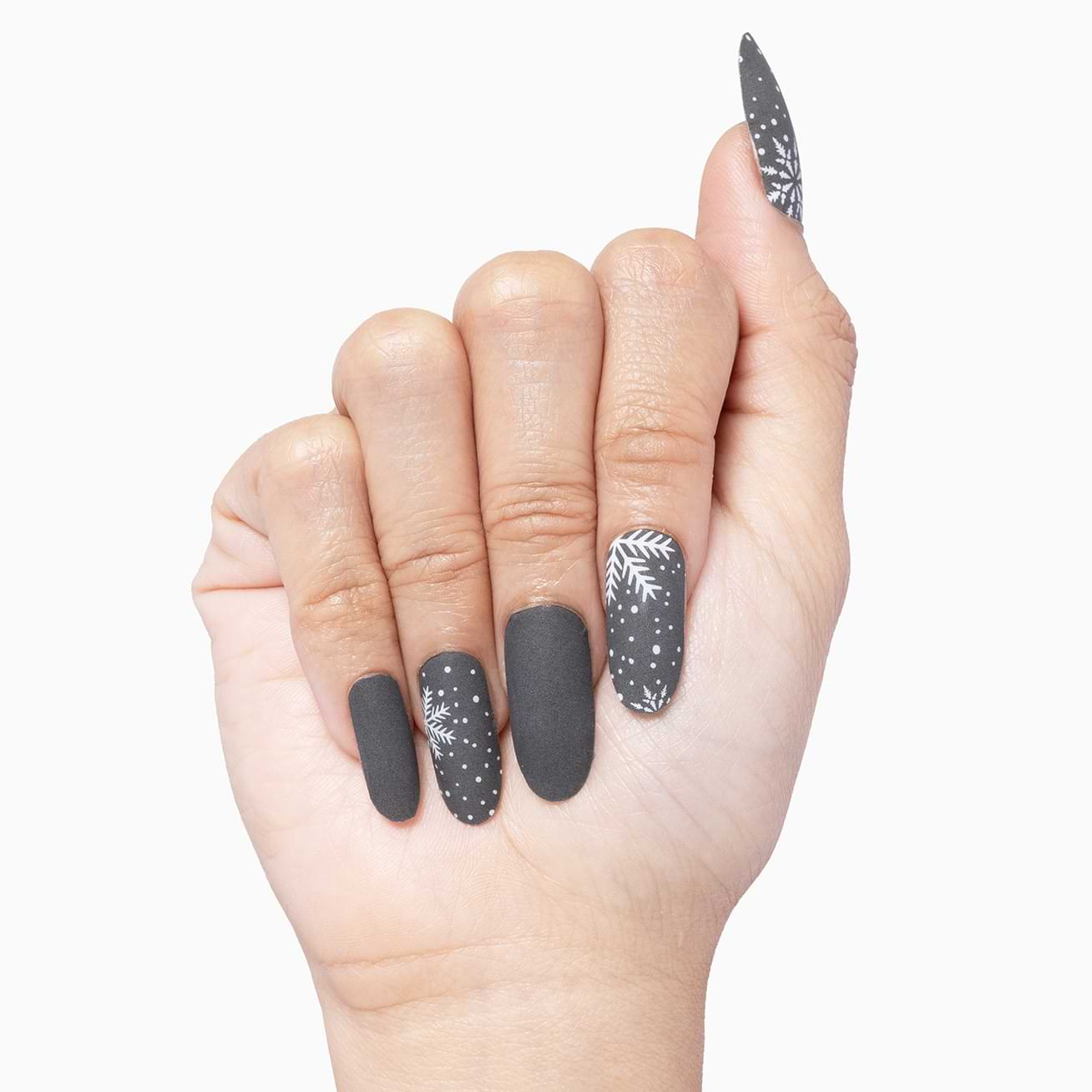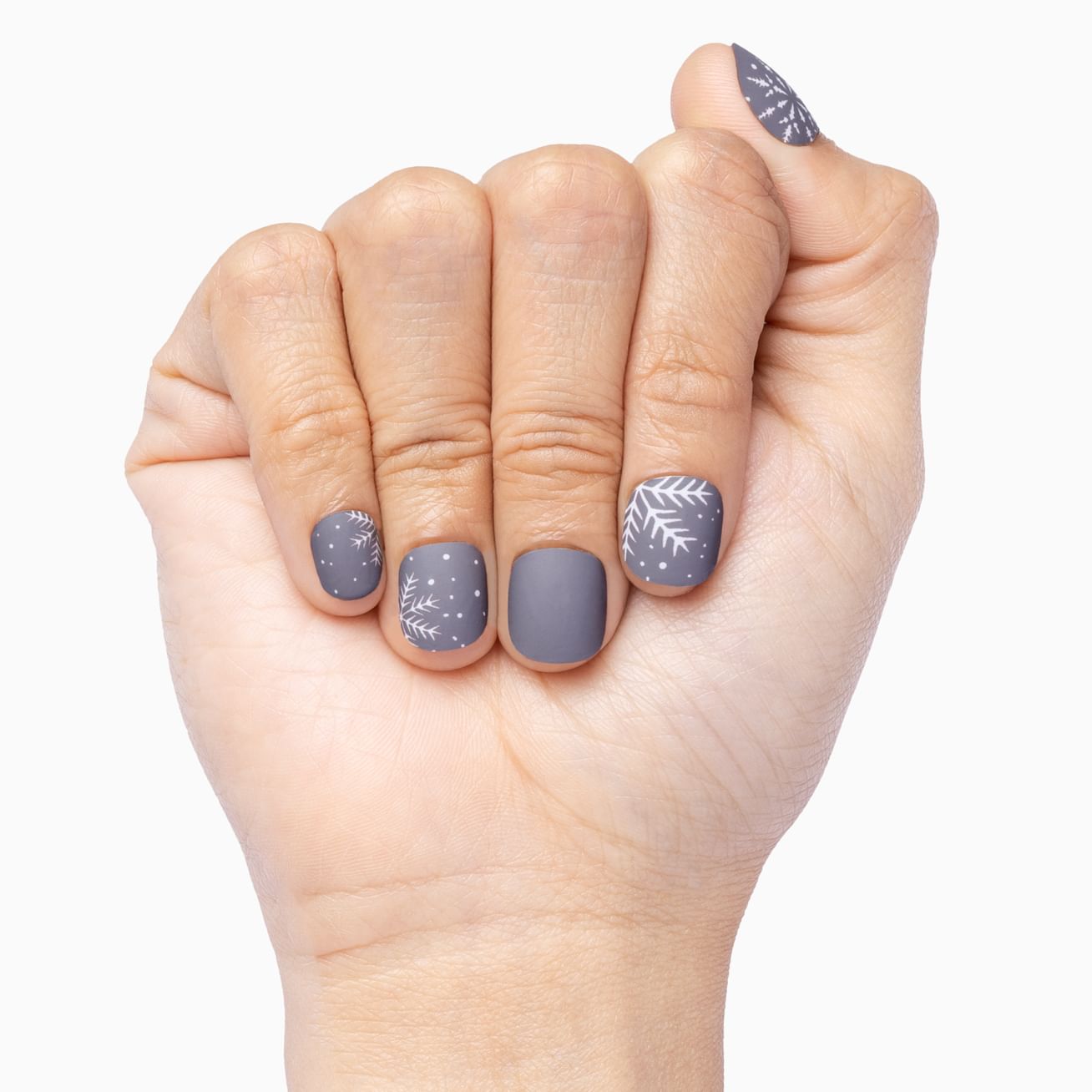 Sometimes the right manicure comes into our lives for a reason and we've been changed for good. Up To Snow Good features white snowflakes against medium-gray background to bring matte bliss to your winter manicure. Be sure to use a matte top coat to keep this matte look going for weeks.