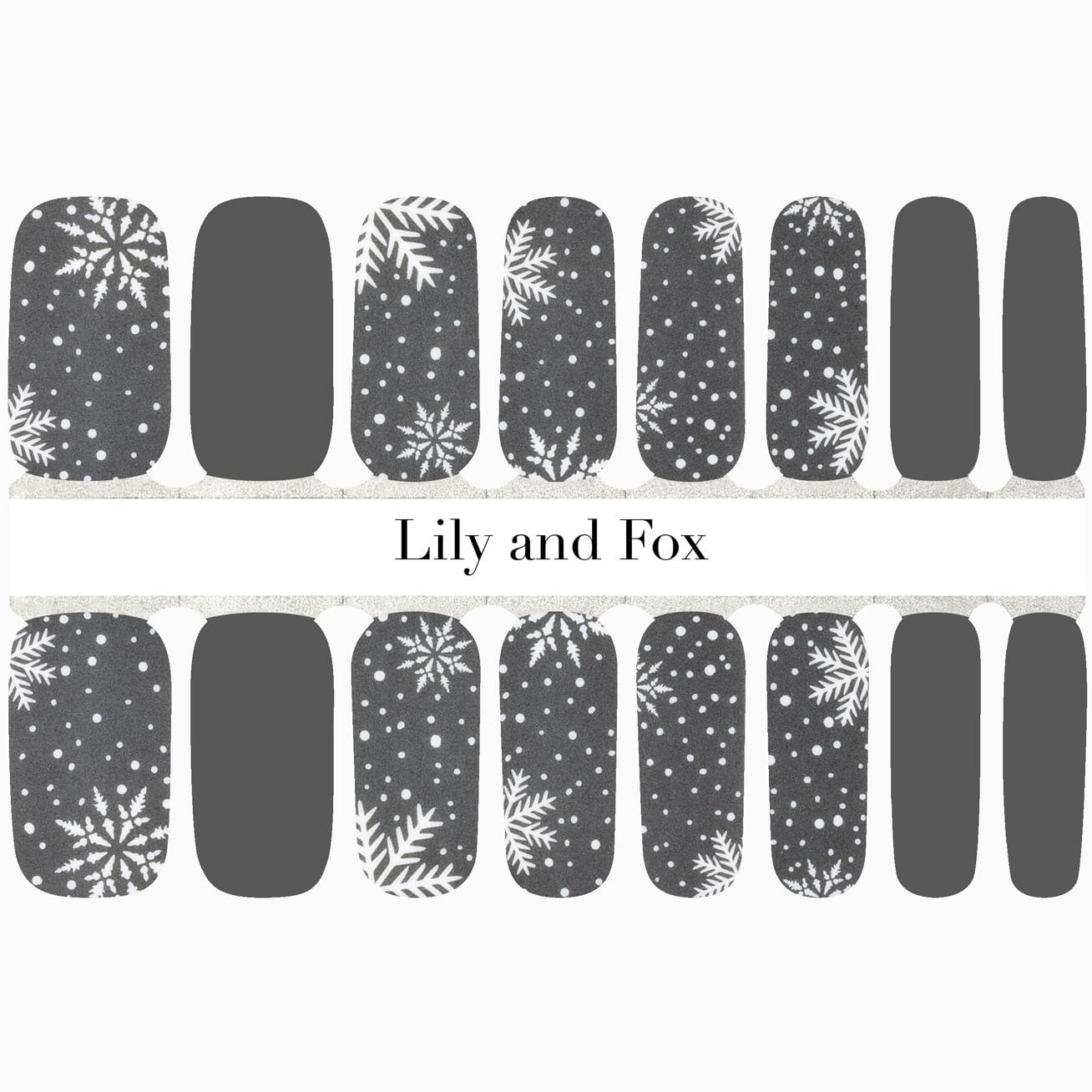Mistlesnow features metallic-kissed mistletoe mixed with red, white, and gray snowflakes set across a dramatic glossy, black background. This is a perfect set for either long or short nails. Let the mistlesnow linger a little longer by topping it off with a swipe of top coat.