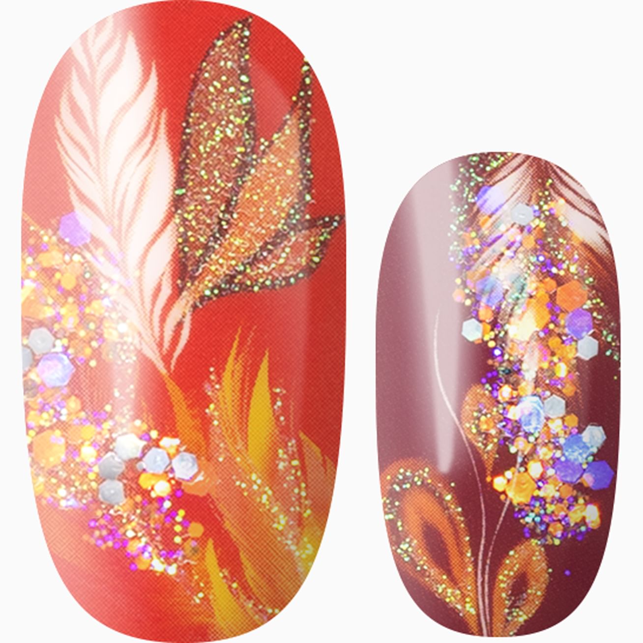 Golden Embers features a range of rich, warm reds, oranges, and golds against a glossy background. The feathery, fiery designs are accented with both iridescent fine and big glitter. Flip this design upside down on some nails for a completely custom manicure. You're fire! Protect the manicure with a layer of top coat.
