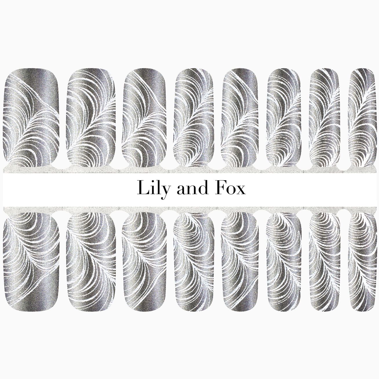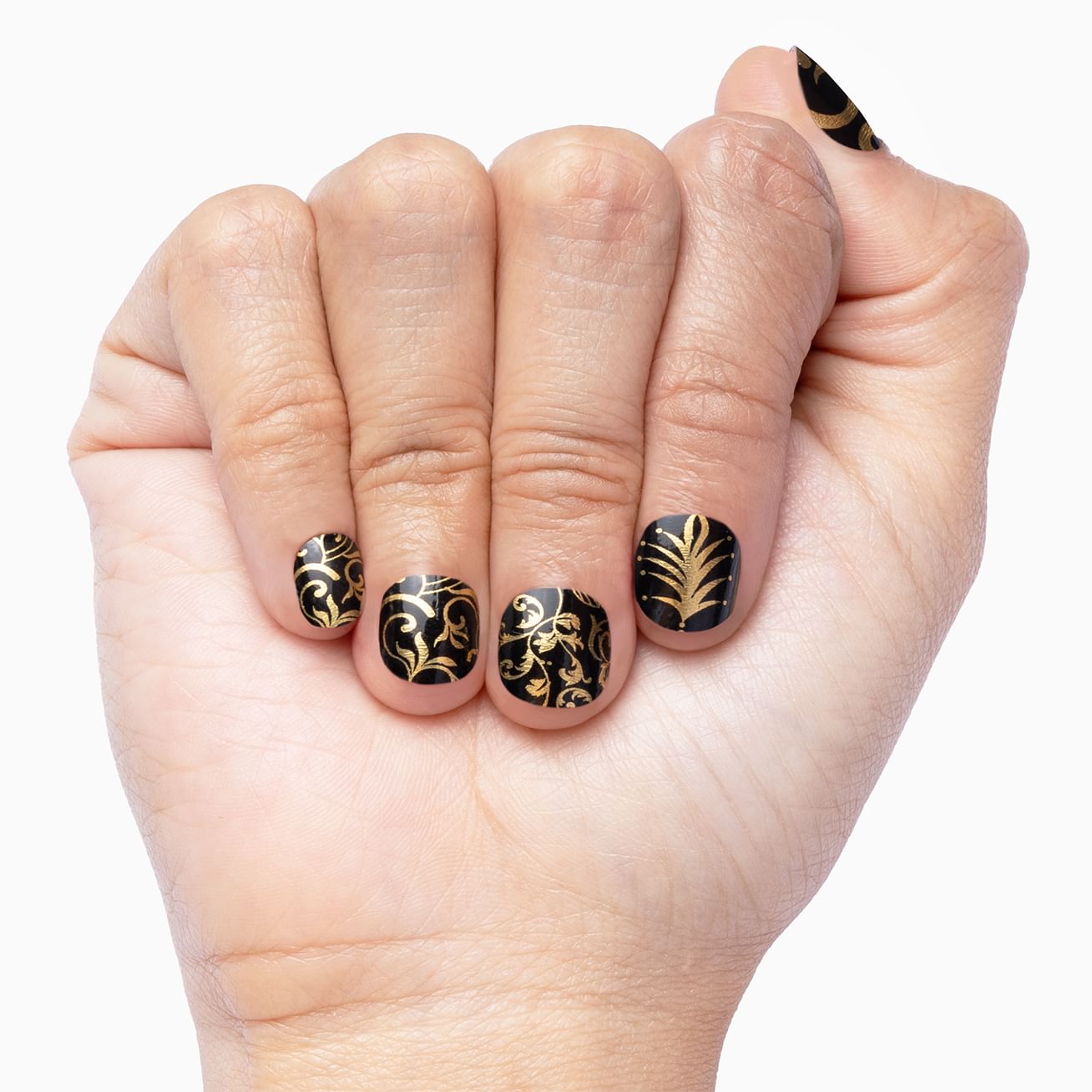 Black and white has never looked more chic than with this dynamic nail wrap set with dramatic black-on-black glitter and black trees against a glossy, white background with glints of metallic gold. Apply this manicure in minutes for a look that will last for weeks.