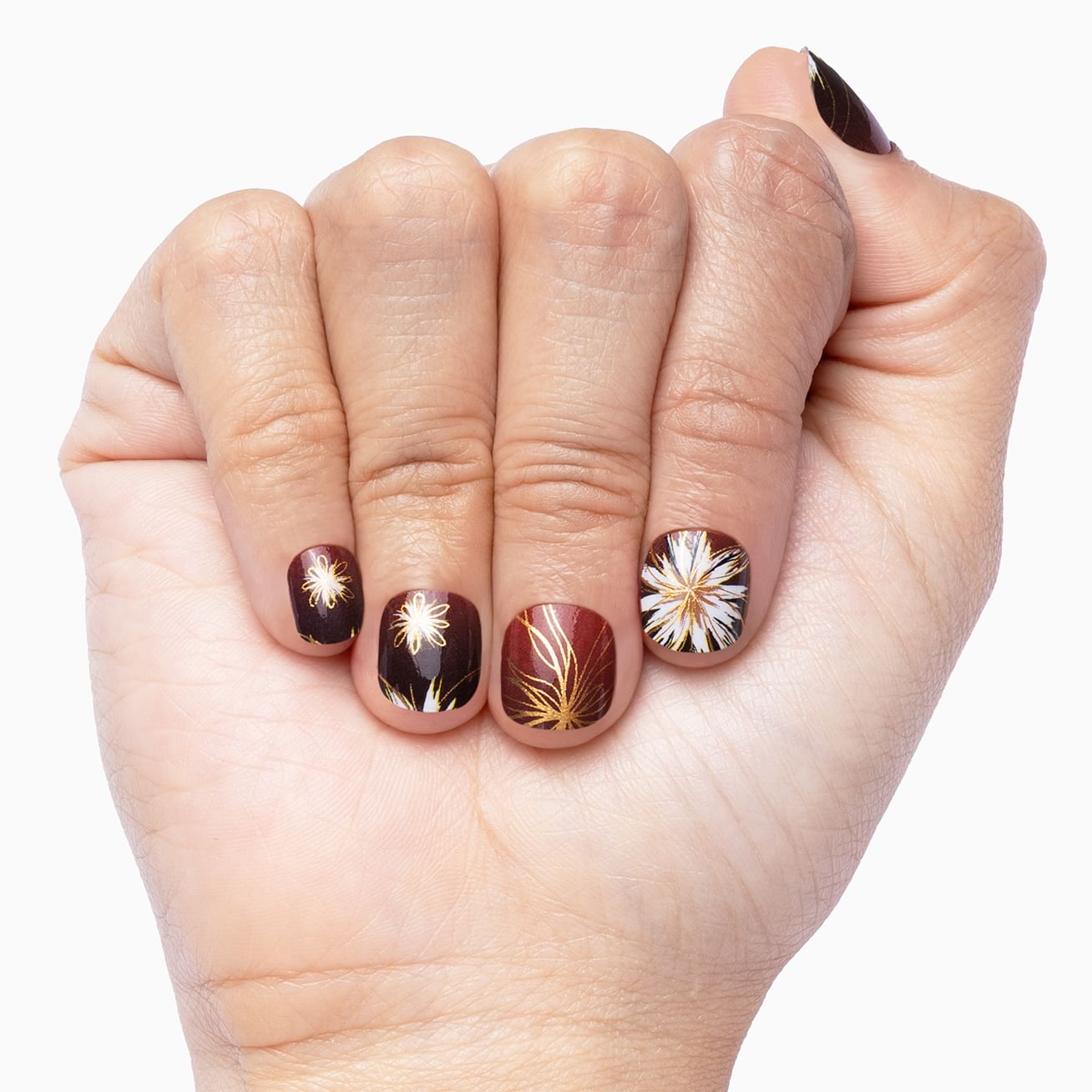 Mystic Night mixes deep burgundy glossy solids with gold metallic celestially-inspired designs featuring stars and moons. Apply in minutes for a look that wows for weeks! Add a layer of top coat for extra-long wear.
