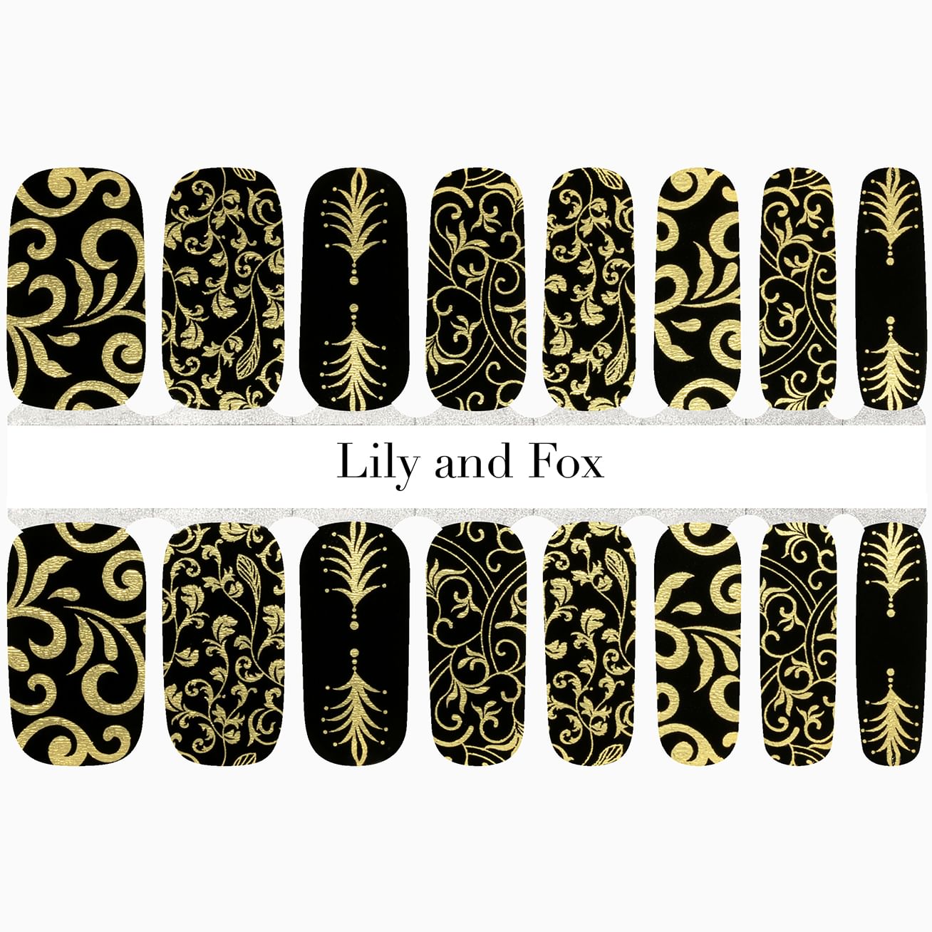 Get swept away in this torrid, Floral Affair. This striking nail wrap set features metallic gold flowers and white flowers laced with tendrils of gold set against a deep maroon to inky black ombre glossy background. The placement of the streaming flowers and quick color shift in the ombre is perfect for either short or long nails. Make this an affair to remember by adding a layer of top coat.