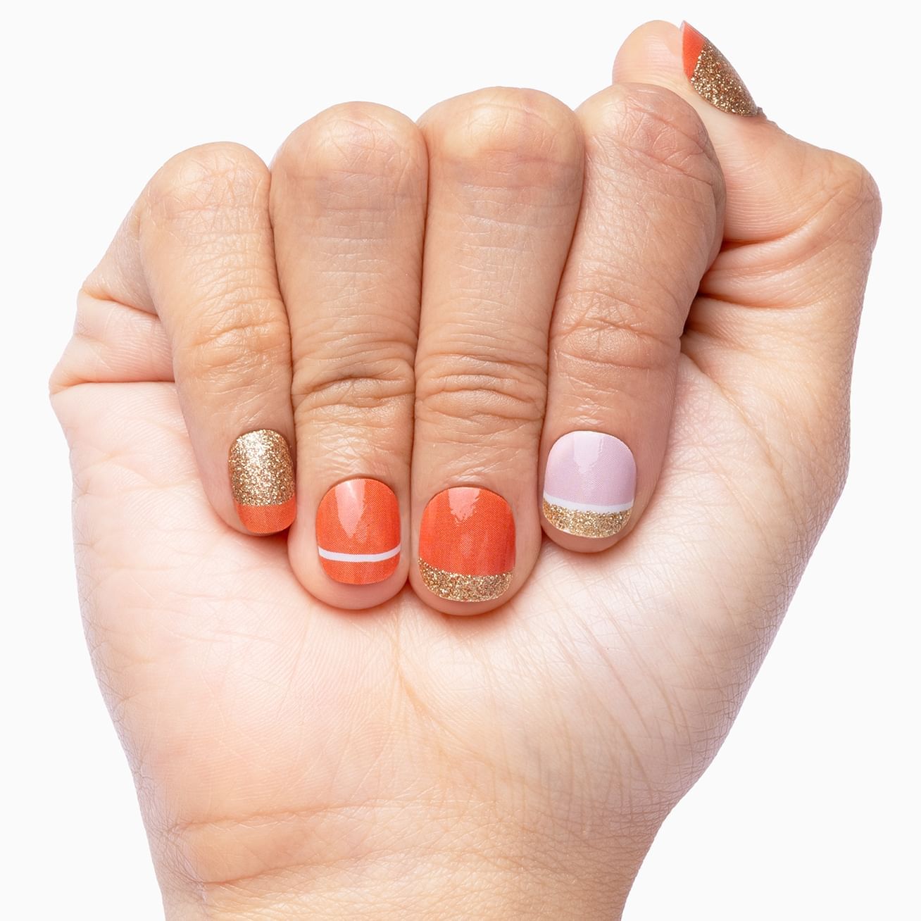 You'll cherish the variety of designs in this beautiful set of deep red, pink, and metallic gold nail wraps that combines dainty cuticle details, bold French tips, and glossy solids. Cherish Me can be applied in moments for a look that will last for weeks.