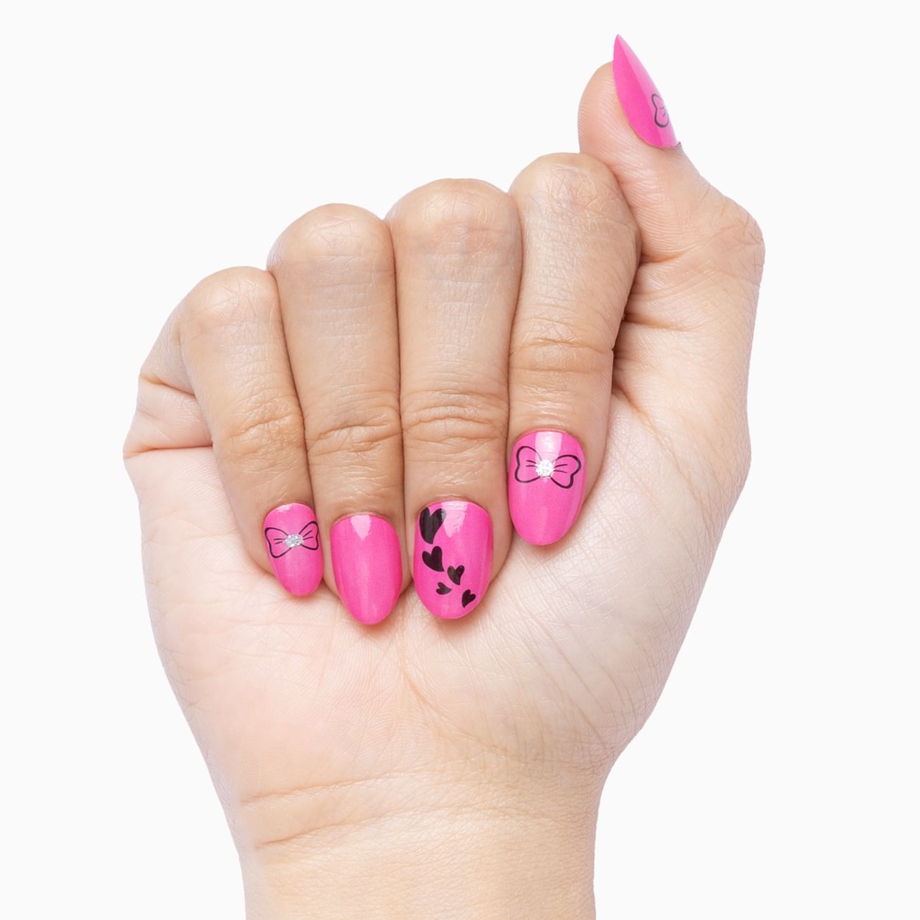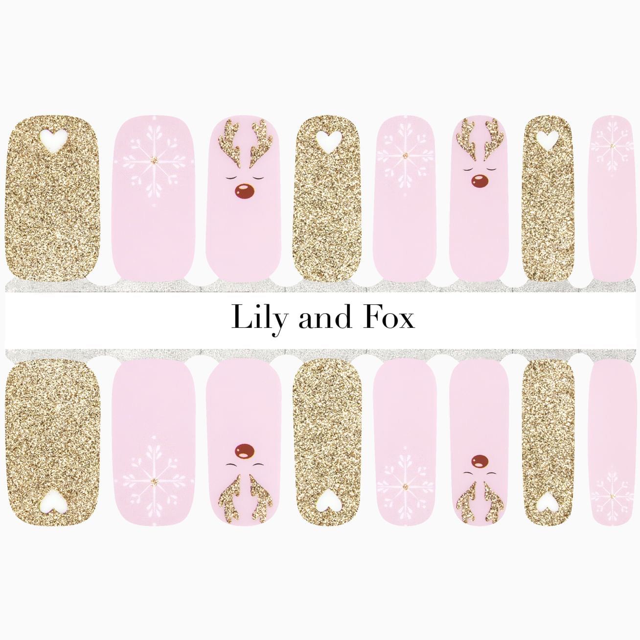 Let Rudolph lead the way to this whimsical wrap set that includes golden sparkles with white hearts at the cuticle, a sleepy reindeer with golden antlers and a red nose set against a pale pink background, and glitter-kissed snowflakes set against that same rosy pink. You must be on the nice list - these nail wraps apply in moments and can hold up to gift wrapping (and unwrapping) and all the holiday activities that keep you jingling all the way!