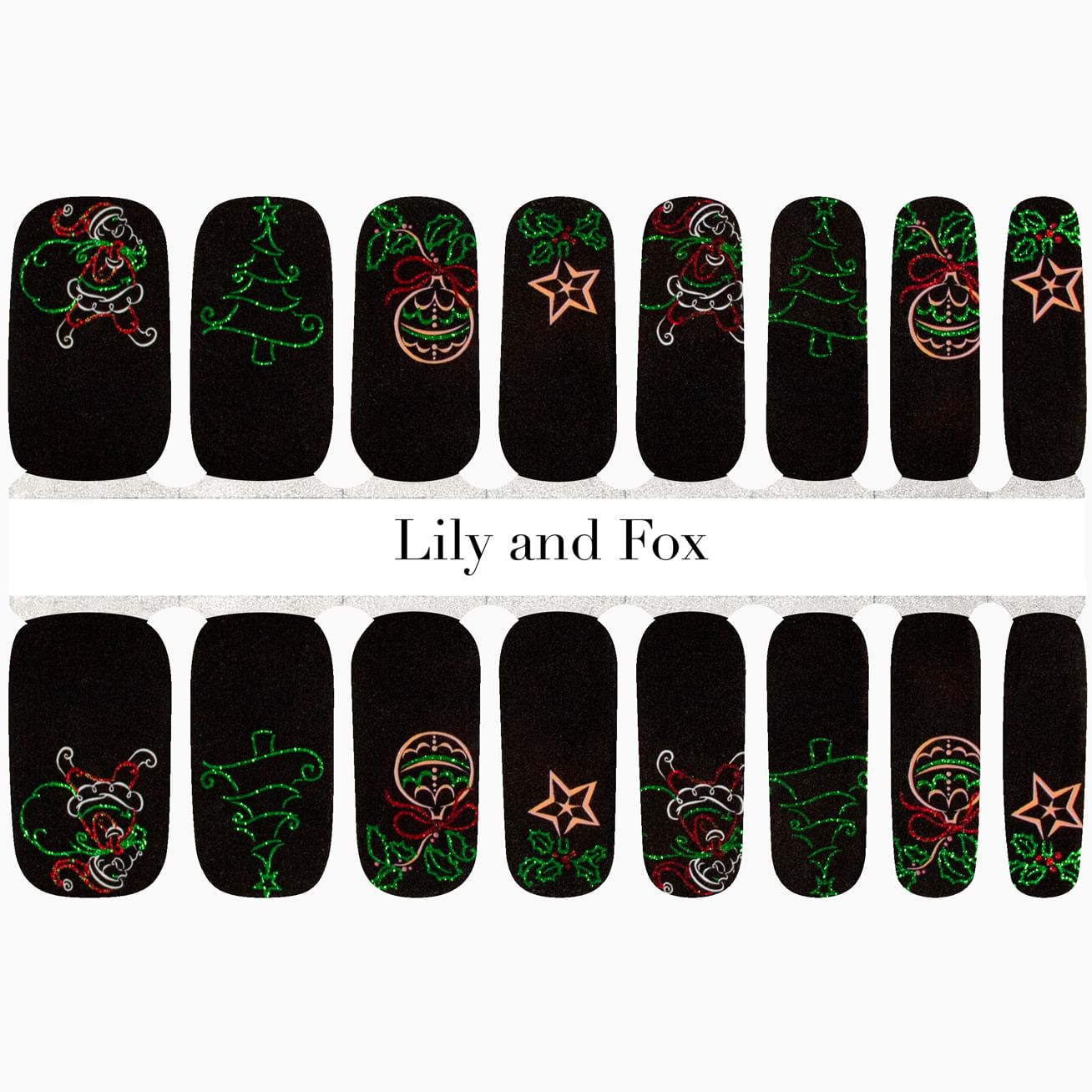 Merry and Bright features jaunty Christmas scenes with Santa, ornaments, and a tree decked out in metallic red and green against a glossy, black background. This dramatic manicure is perfect for longer nails, but Santa won't put you on the naughty list for snipping at his toes. Add a layer of top coat to extend the staying power of this shiny mani.