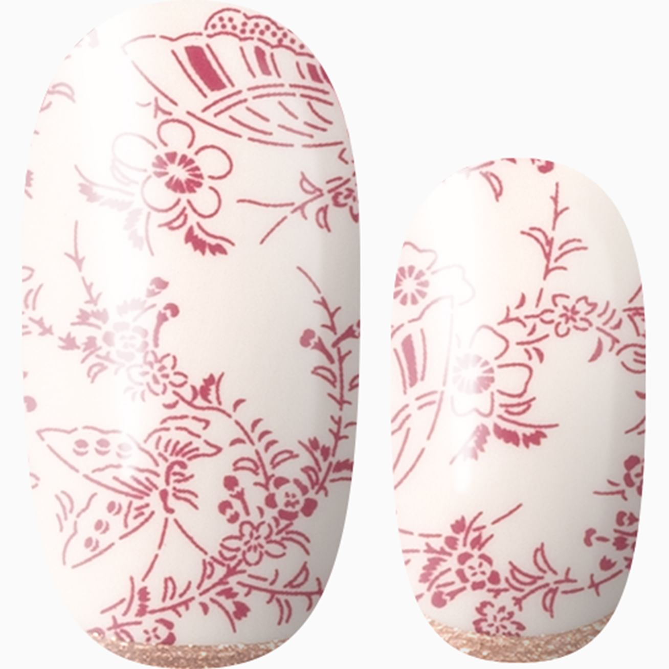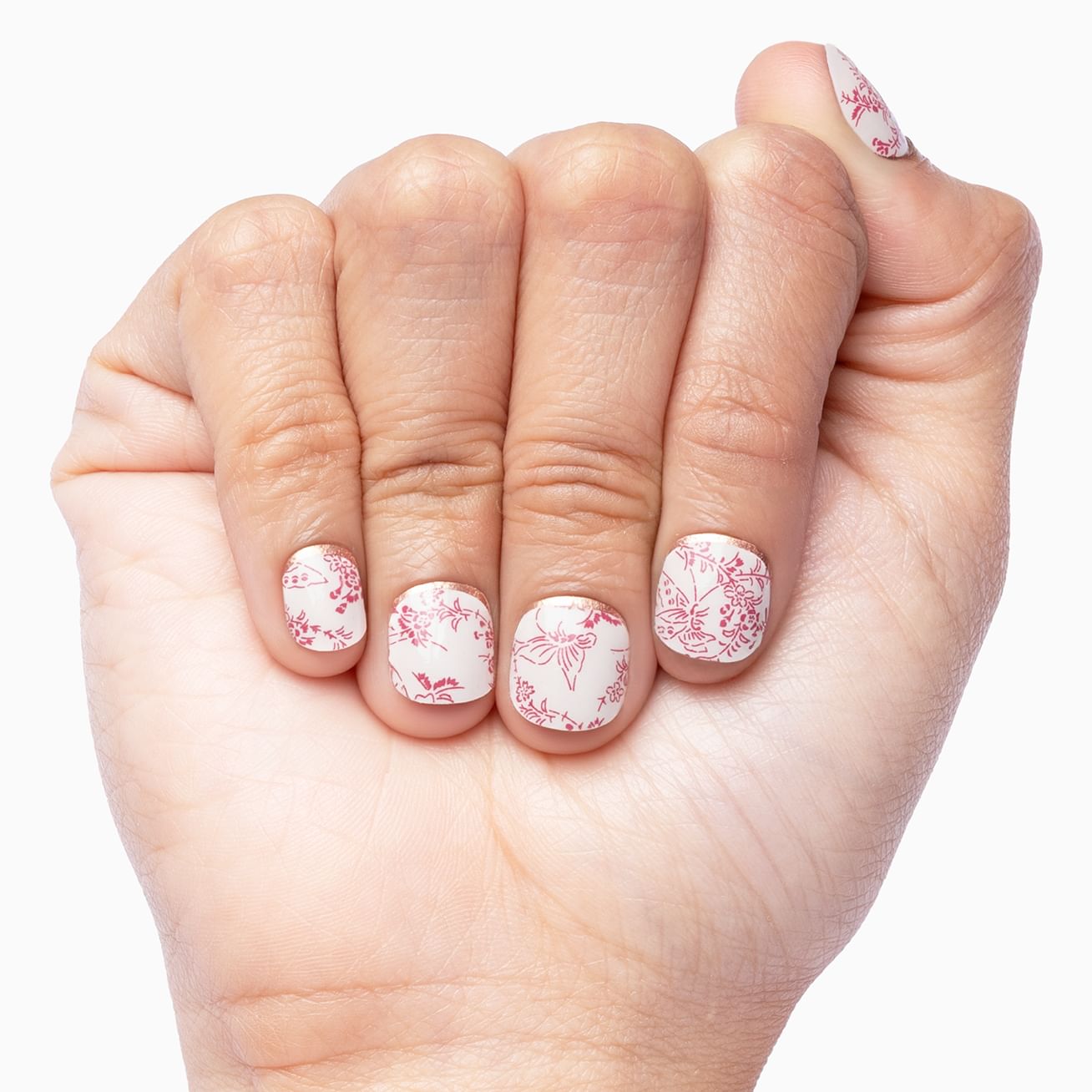 Blushing Petals features a delicate dark-pink floral design set against a light pink glossy background with a sweep of metallic copper just at the cuticle line. Feel cute in minutes with this manicure designed to last for weeks.