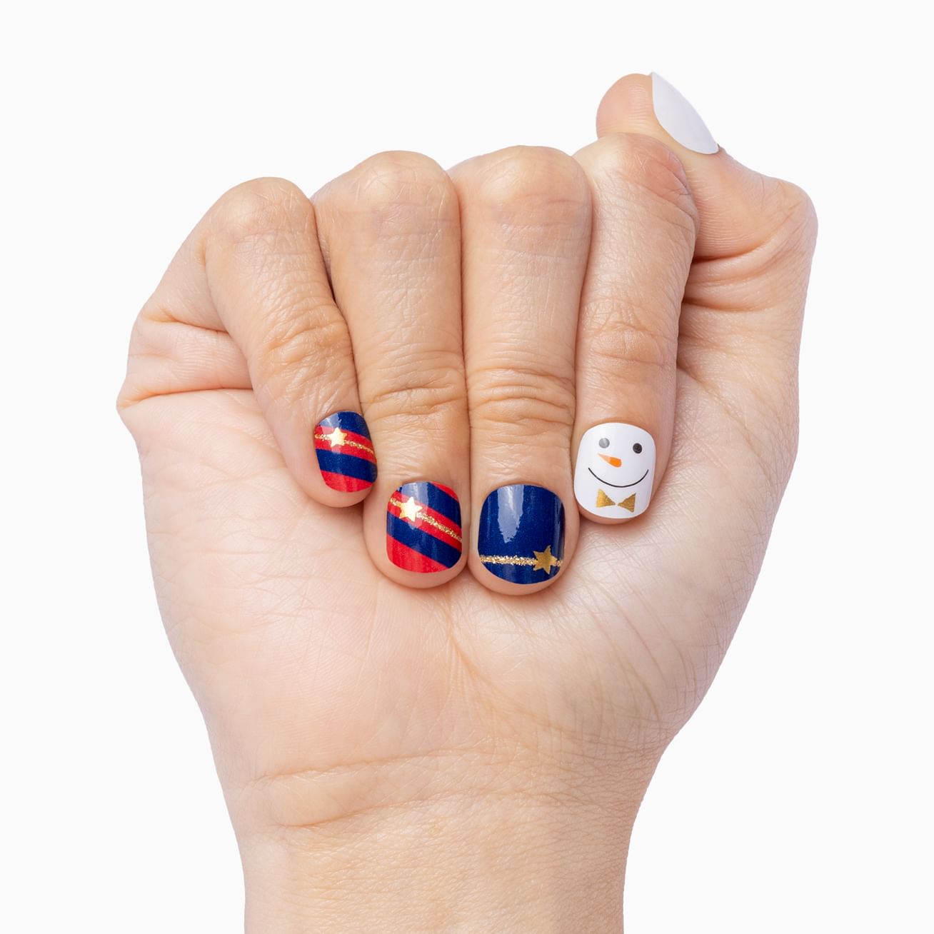 Merry Little Christmas combines rich, glossy navy blue with white snowflakes and gold glitter. The white stripes are transparent to let your natural nail peek through. Have yourself a merry little manicure a little longer by topping off this look with top coat.