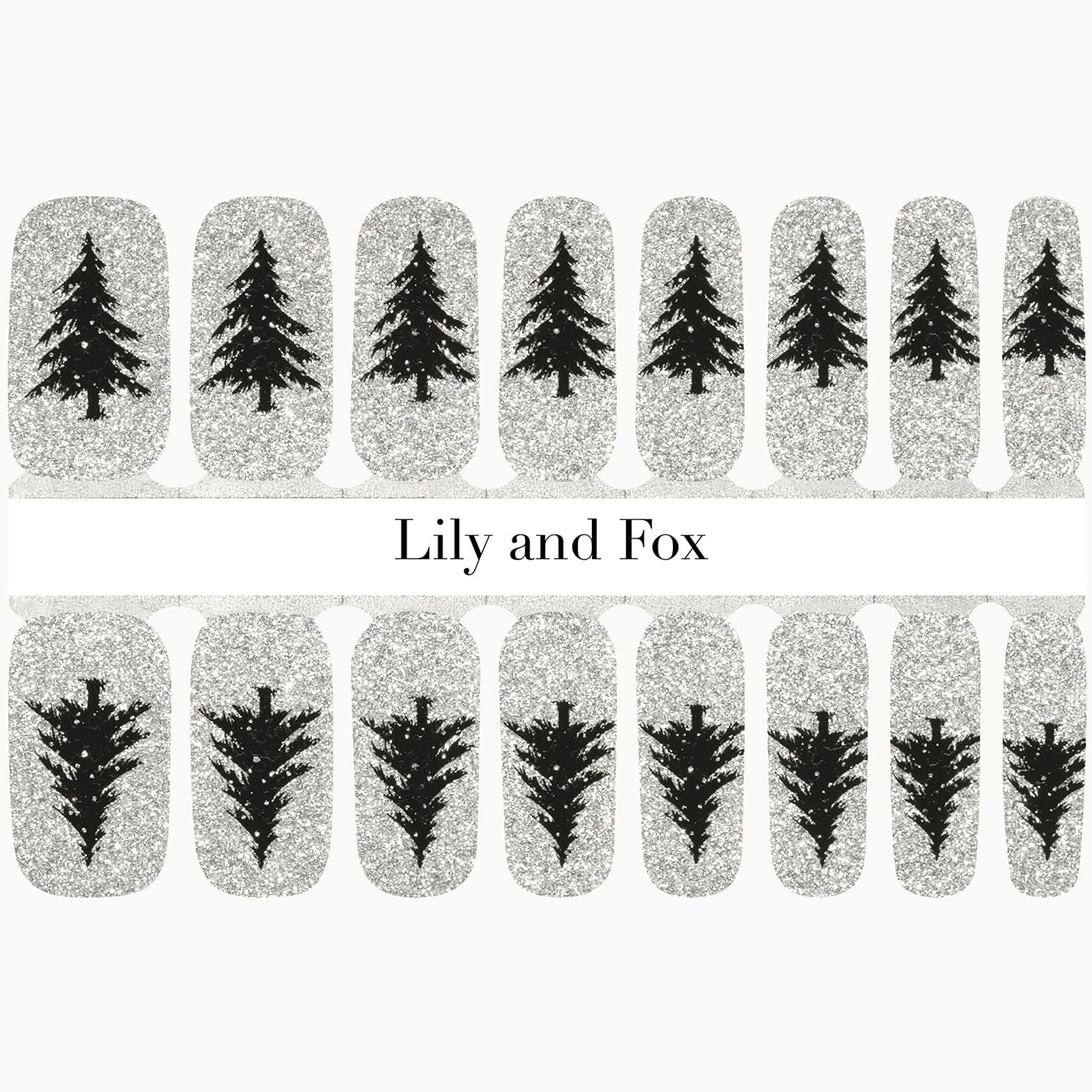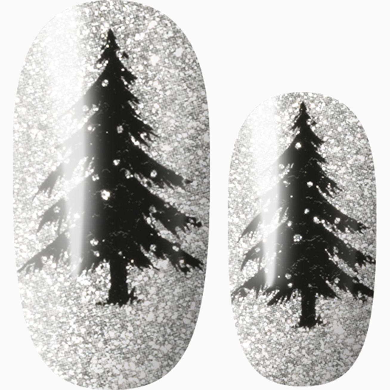 Touch of Winter features dramatic, glossy black pine trees set against silver glitter. A flurry of silver glitter snowflakes graces the trees in a look that brings all the feelings of a brisk walk in the woods with pristine, glistening snow. Apply in minutes for a look that lasts for weeks.