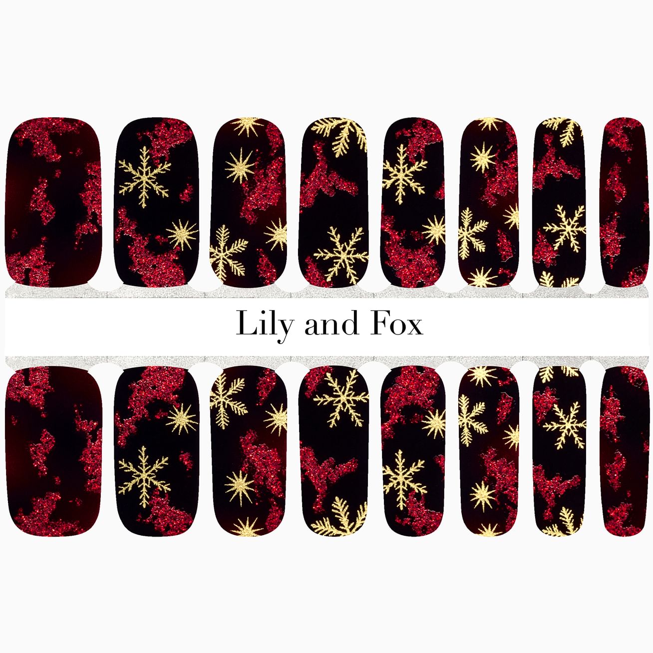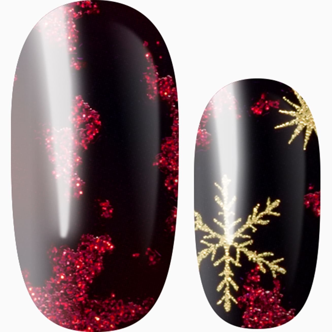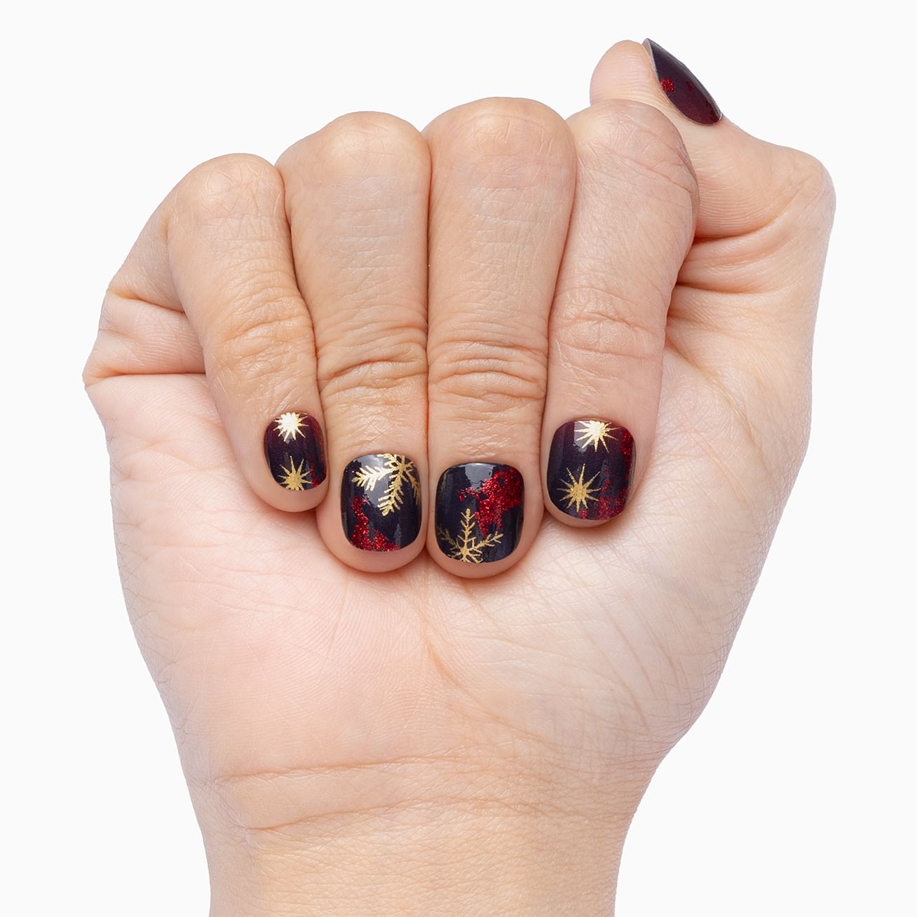 Feel like the belle of the winter ball with North Pole Gala. With rich red glitter marbling against a black-tie backdrop sprinkled with gold metallic snowflakes, this manicure is dressed to impress. This wrap can be applied in minutes, leaving you plenty of time to dance the night away.