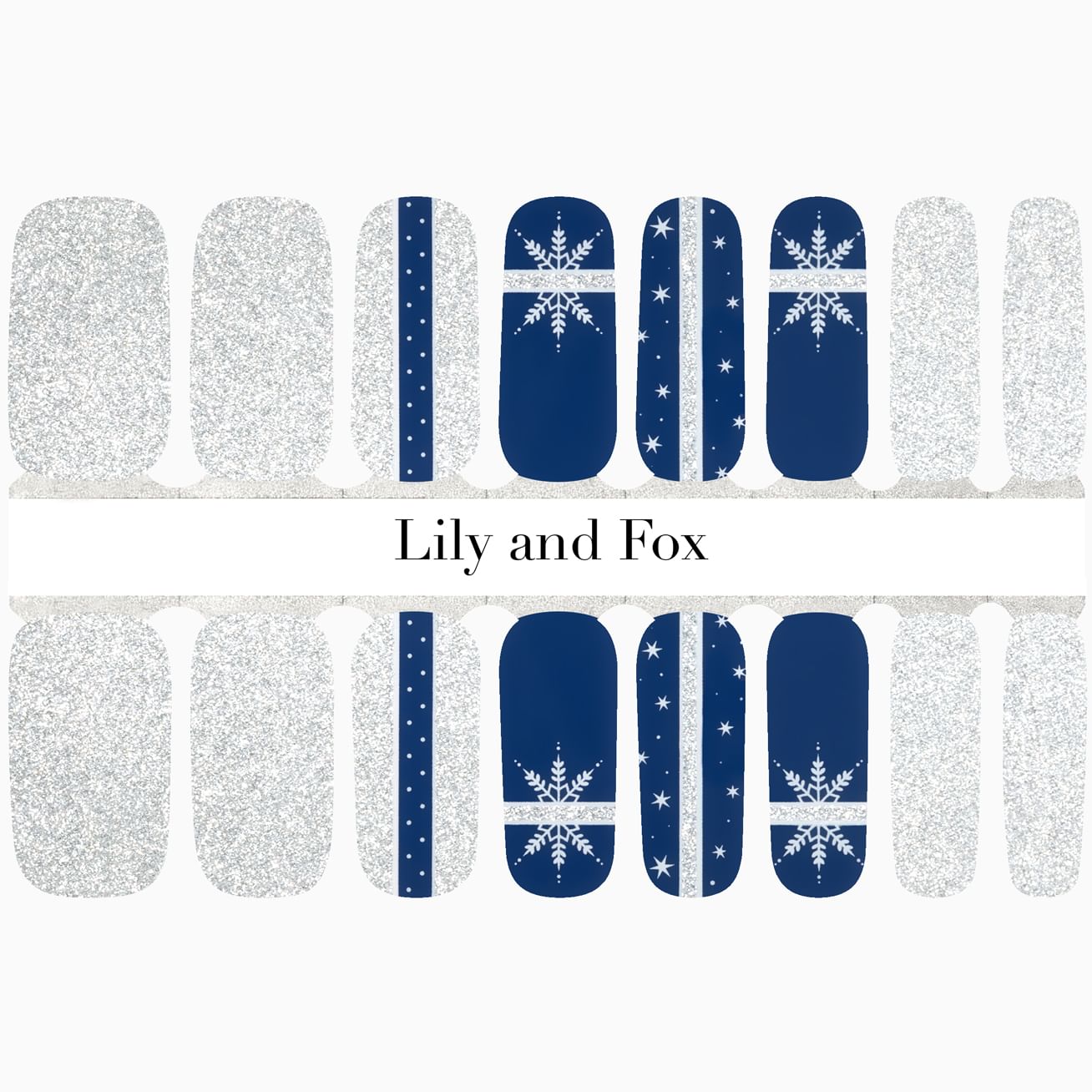 Let your fingertips pirouette into a winter dream with Sugarplum Fairy. Soft, silvery glitter is sprinkled over dreamy sold blue is paired with a delicate ombré design that kisses the cuticle with just a whisper of blue that fades into ballet-slipper pink with dainty white snowflakes. These wraps feel like a fairytale dancing across your nails - graceful, frosty, and full of holiday magic.