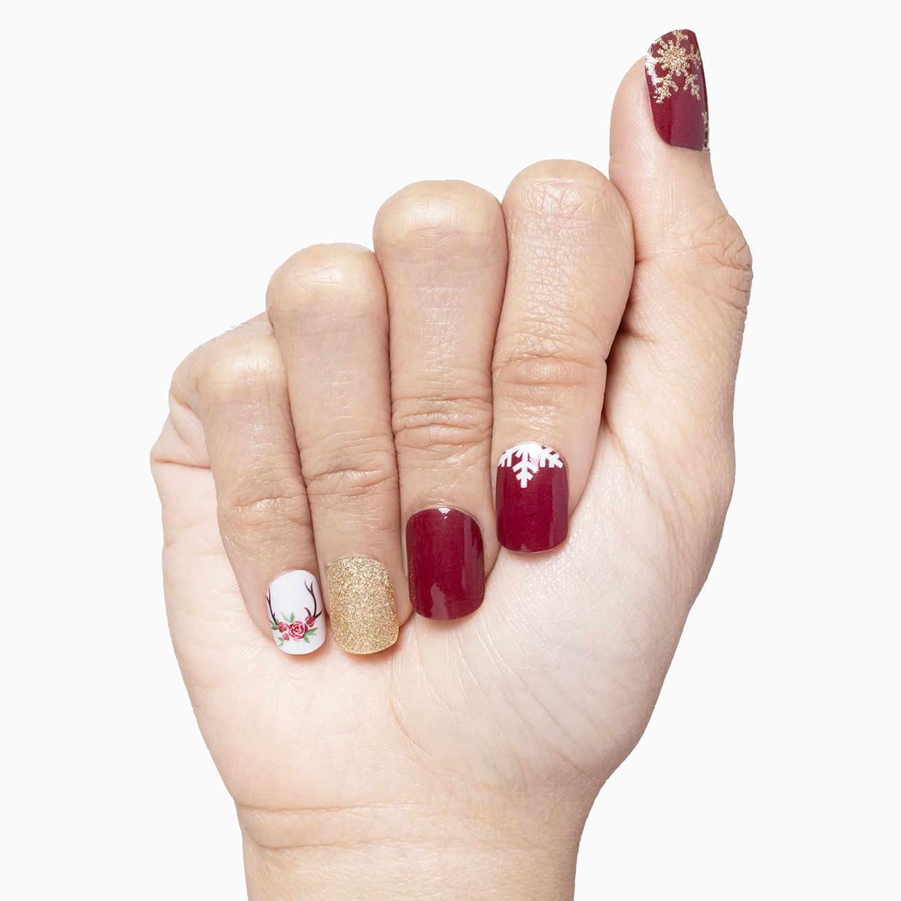 You can rule the holiday season with this beautiful mixed manicure set featuring deep, glossy reds topped with gold glitter snowflakes, a design featuring a hint of a white snowflake at the cuticle, full-glam gold glitter, and an accent wrap of reindeer antlers with a crown of roses set against a white background. Yes, queen! Extend your reign by adding a layer of top coat.