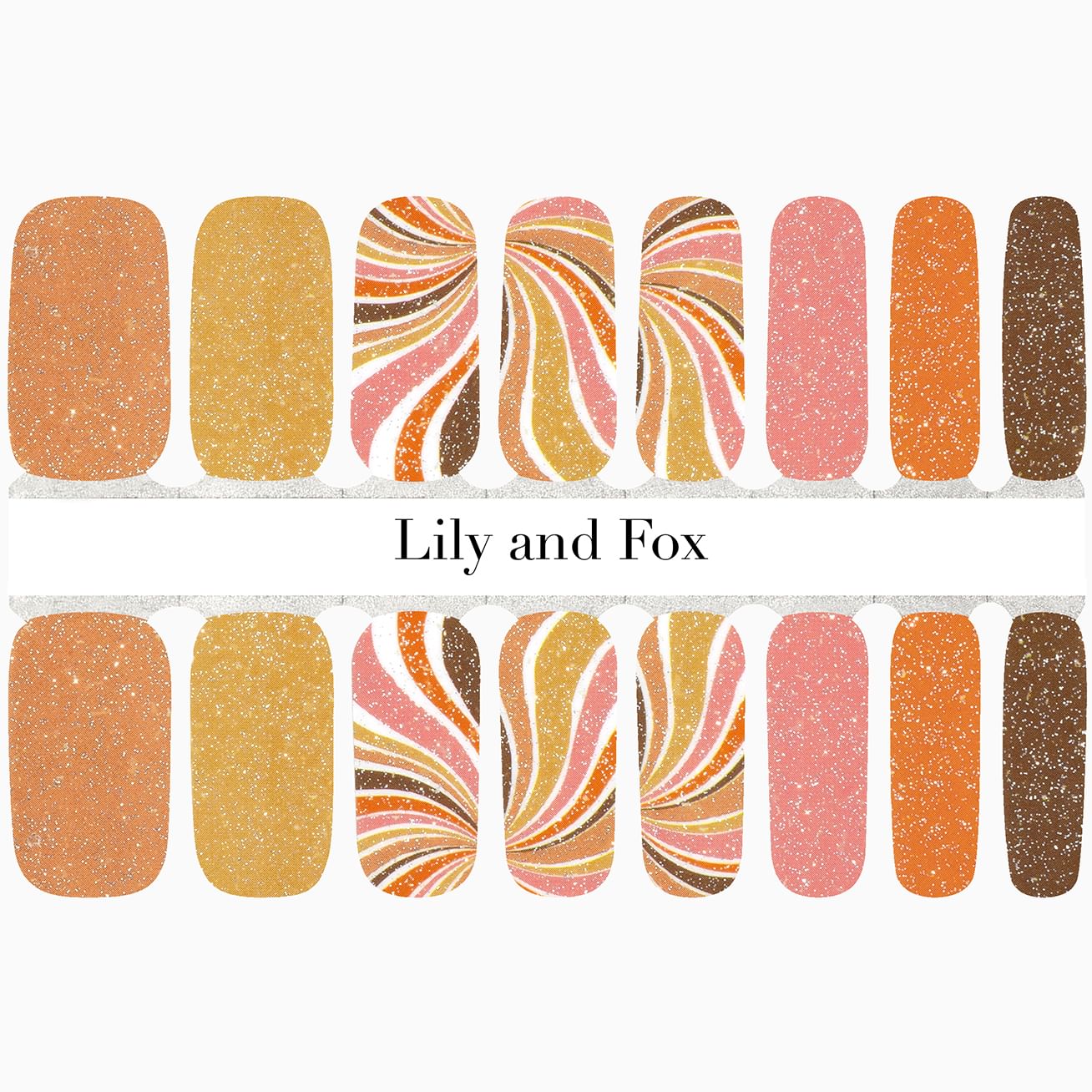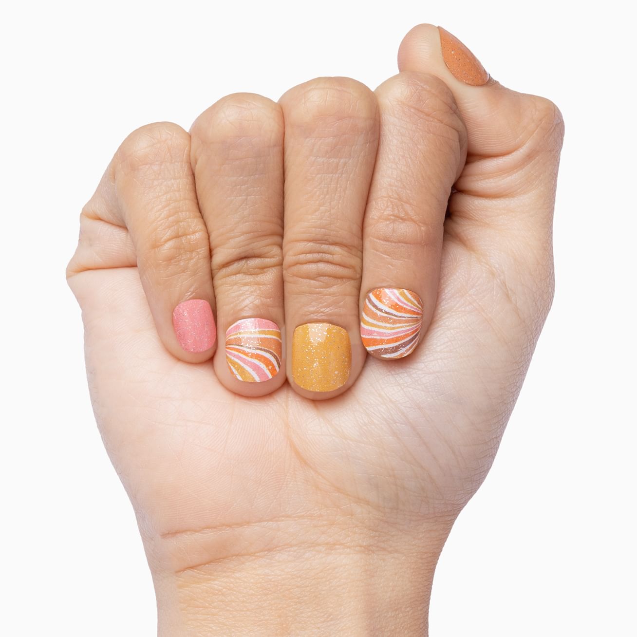 This nail wrap pattern will have you looking for fun and feeling groovy with its mod-1960s swirls and warm pinks, oranges, and browns all topped off with a little silver glitter. You won't be hearing the sounds of silence because everyone, including me and Julio down by the schoolyard, will be complimenting your nails. You gotta make this mani last so apply a layer of top coat.