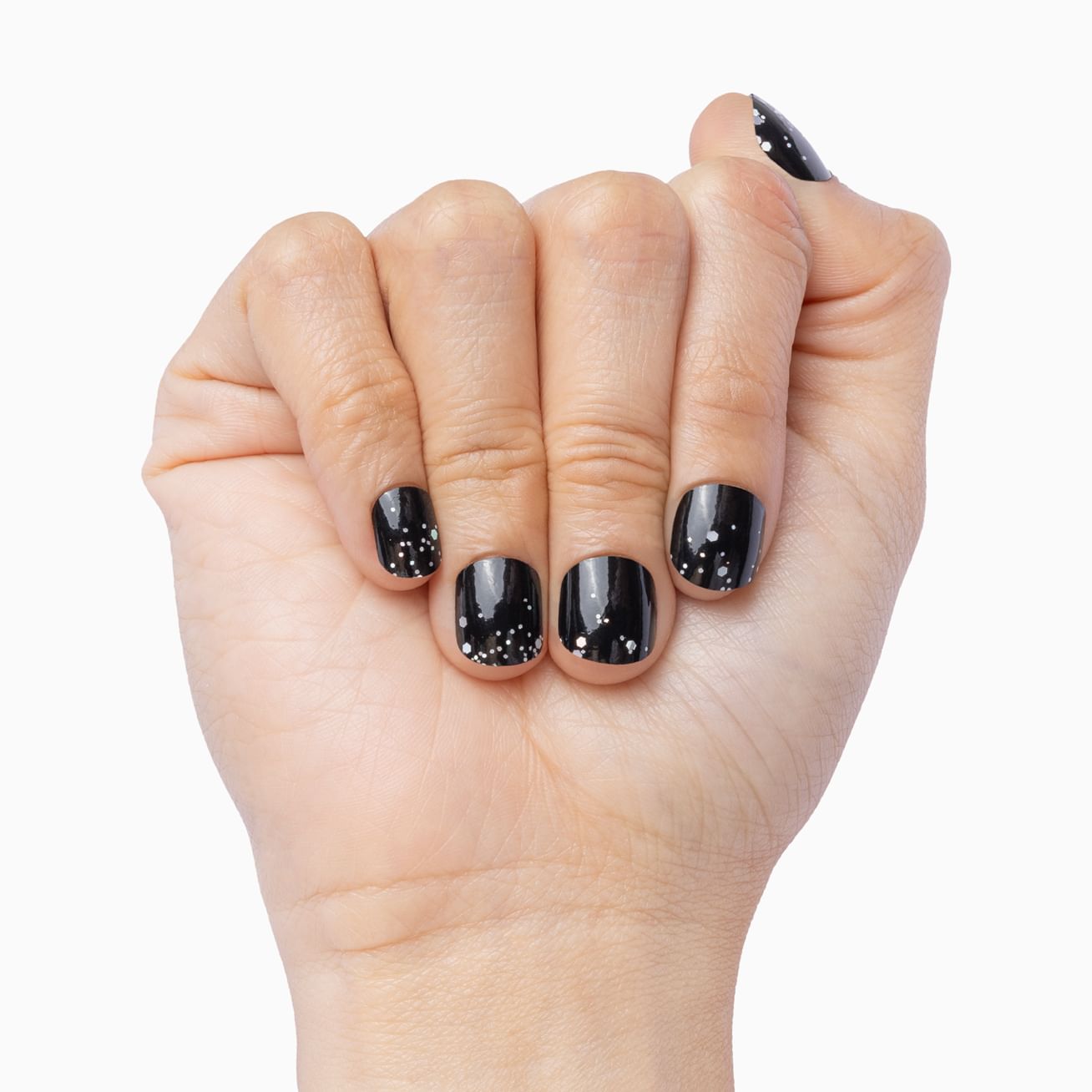 Merry and Bright features jaunty Christmas scenes with Santa, ornaments, and a tree decked out in metallic red and green against a glossy, black background. This dramatic manicure is perfect for longer nails, but Santa won't put you on the naughty list for snipping at his toes. Add a layer of top coat to extend the staying power of this shiny mani.