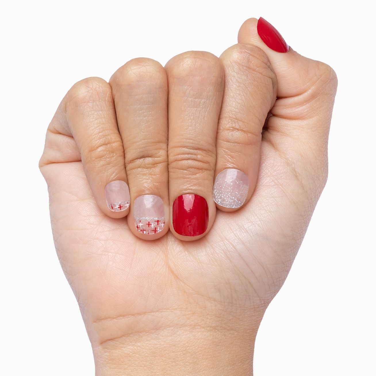 Golden Greetings is one of most popular holiday designs featuring a classic red and black plaid striped with gold glitter complemented by solid gold glitter wraps. Keep this look under wraps by adding a layer of protective top coat.