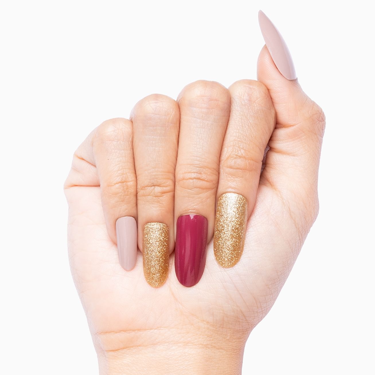 Golden Greetings is one of most popular holiday designs featuring a classic red and black plaid striped with gold glitter complemented by solid gold glitter wraps. Keep this look under wraps by adding a layer of protective top coat.