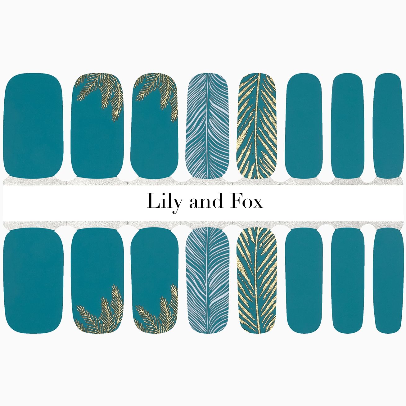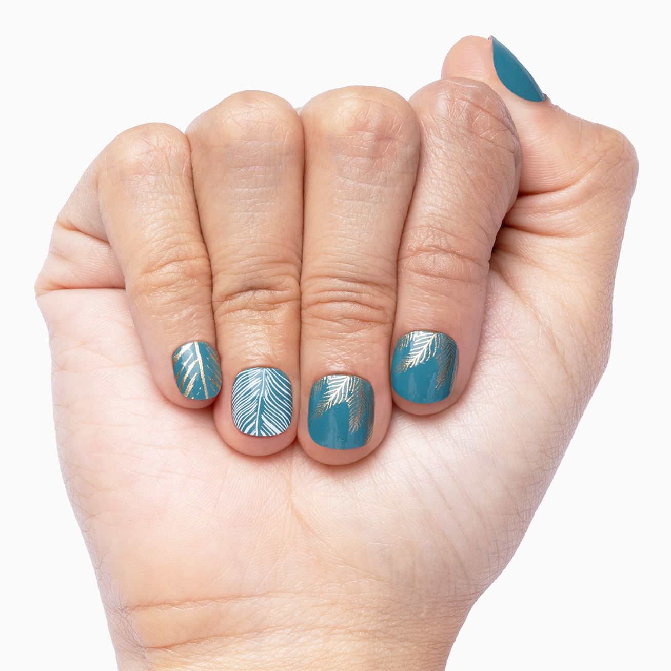 Whispering Palms features a gorgeous, glossy turquoise background with delicate white and golden glitter leaves. With the design right at the cuticle, this manicure is perfect for long and short nails. Add a layer of top coat to keep this tropical look going for weeks.